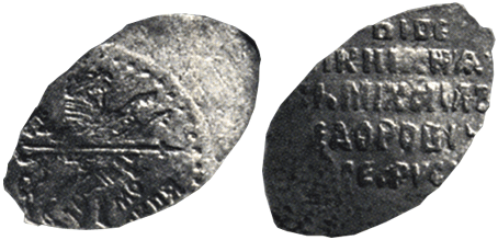 Копейка, чеканенная в 1613 году на Московском денежном дворе посредством штемпелей, привезённых из Ярославского денежного двора. Знак С/ЯР заменён на С/МД. Серебро, размер 13х14 мм. |